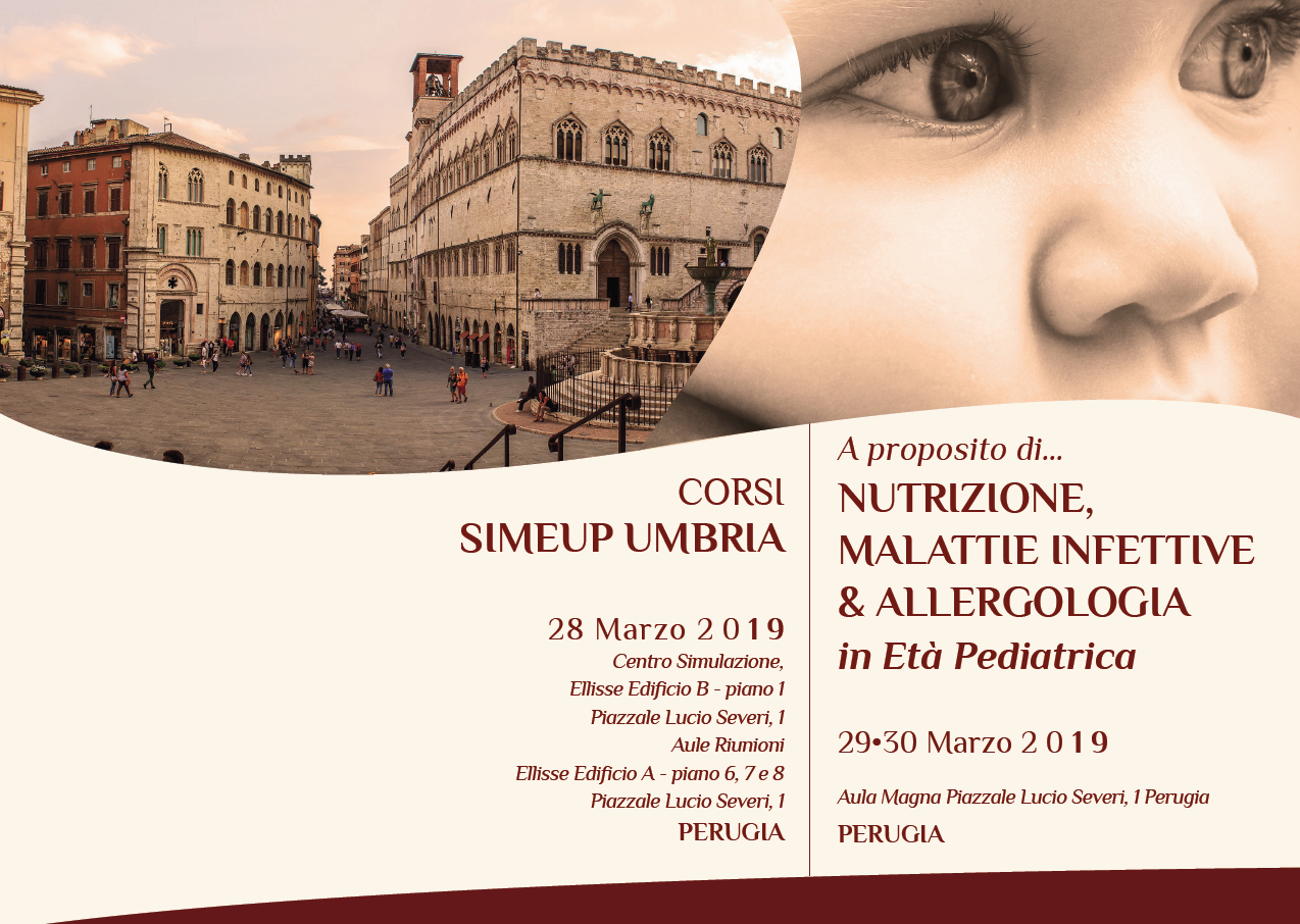 - il Congresso ” A proposito di… Nutrizione, Malattie infettive & Allergologia in Età Pediatrica ” che si svolgerà in data 29/30 Marzo 2019 presso l’Aula Magna del Rettorato, Università degli Studi di Perugia.